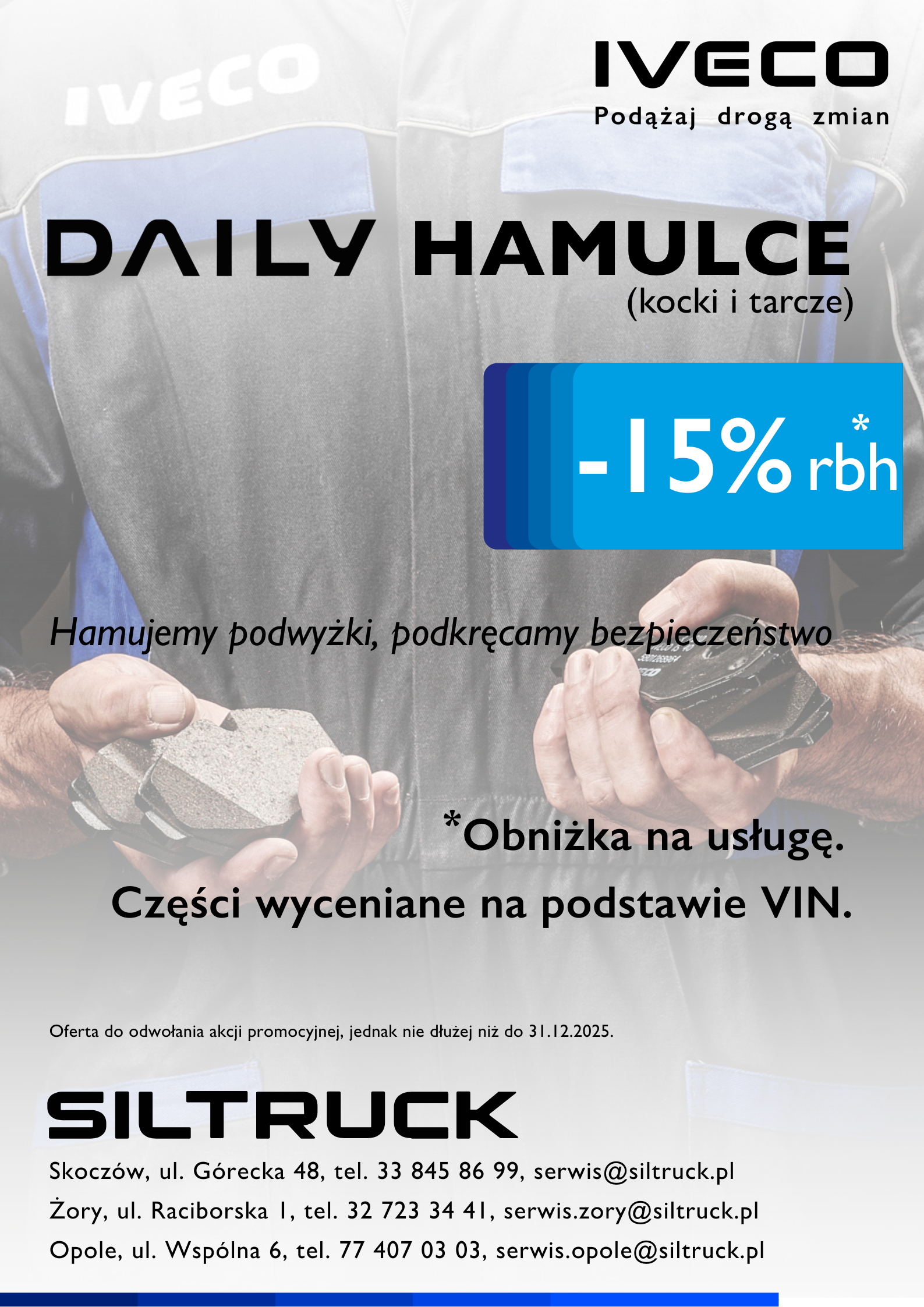 Zatrzymujemy rosnące ceny, ale nie zatrzymujemy Twojego biznesu. Dzięki naszej promocji układ hamulcowy Twojego Iveco pozostaje w pełnej gotowości, a Ty jedziesz dalej – pewnie, bezpiecznie i bez niepotrzebnych kosztów.